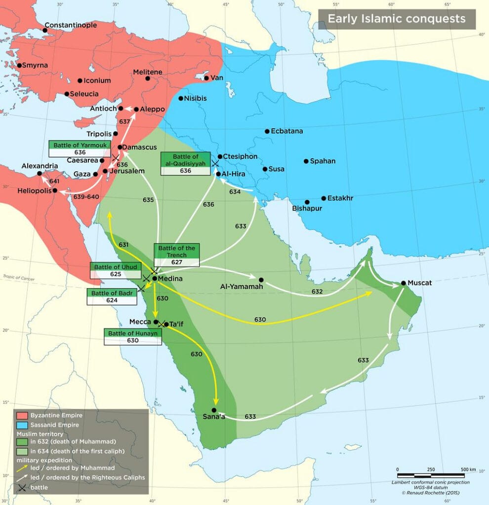 Dit is het moment waarop de islam zich begint uit te breiden. Dat gebeurt met opmerkelijke snelheid en consistentie. Niet door stille culturele uitwisseling, maar vooral door georganiseerde militaire veroveringen die hele regio’s hervormen.